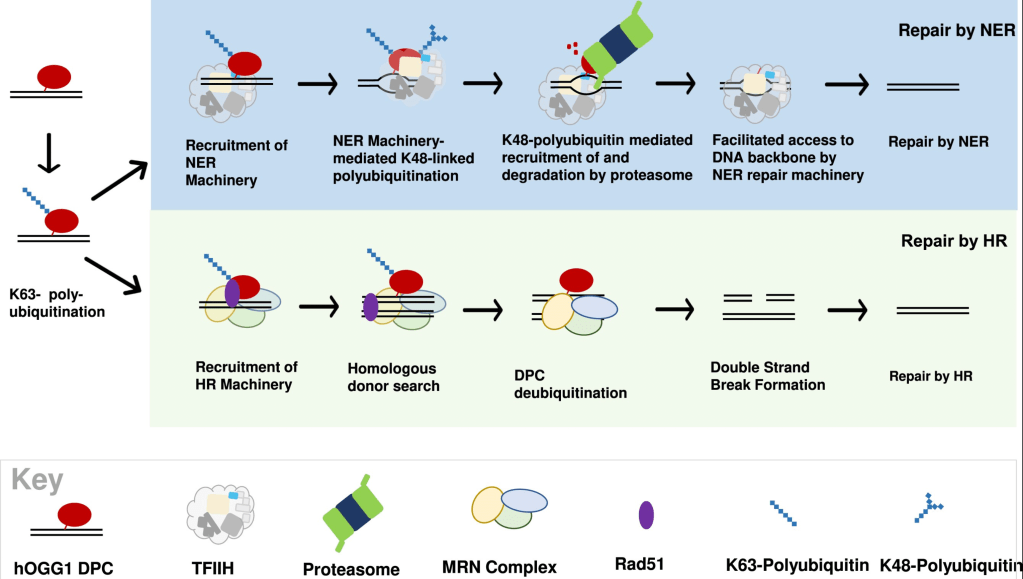 - Different DPC repair pathways are mediated by different polyubiquitination signals on the DNA-crosslinked protein (K48 and K63).