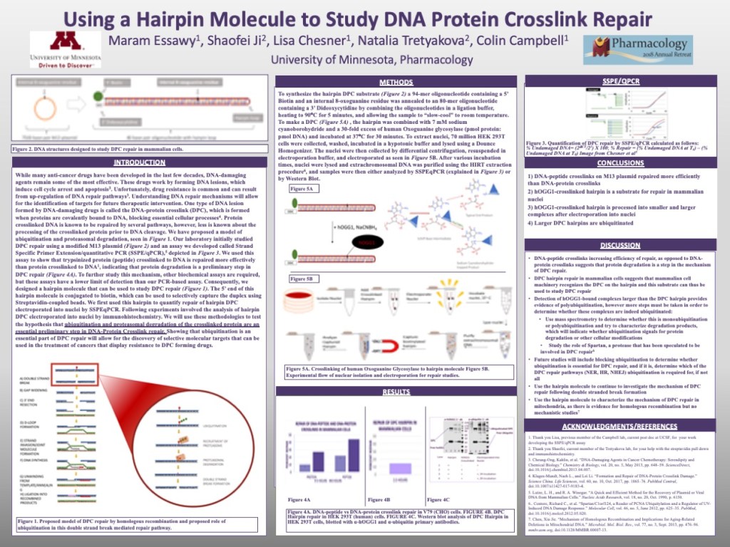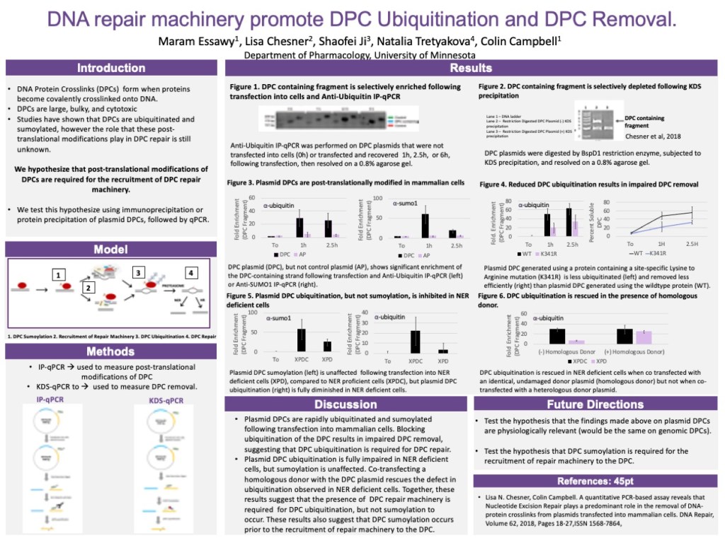 I completed my PhD thesis work in the Campbell lab at the University of Minnesota-Twin Cities, where we studied mammalian mechanisms of DNA Damage Recognition and Repair. My work in particular was focused on a form of DNA damage called the DNA-Protein Crosslink, or DPC. DPCs are large, bulky, cytotoxic lesions that form when proteins become covalently and irreversibly attached to DNA. While it is known that DPCs are subject to multiple DNA repair pathways, including Nucleotide Excision Repair (NER) and Homologous Recombination (HR), the mechanism of orchestration of DPC repair is not well understood. My work focused on studying the role of ubiquitin and the proteasome in DPC repair, and culminated in the development of a novel, detailed model for how differential polyubiquitination modulates DPC repair by NER and HR. This work has been described in my thesis dissertation, which has can be found here, and in a manuscript that has been submitted for publication and is currently undergoing reviewer-recommended revisions. I can’t wait to publish this manuscript and display it here on my website!